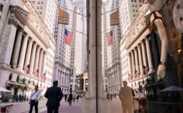 A reflection of a window shows the New York Stock Exchange on Monday, June 30, 2025,...