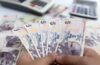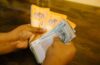 A bank worker counts a stack of US dollars together with stacks of 100 Chinese yuan notes in the east...