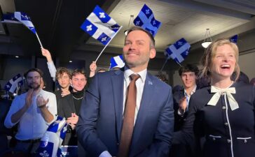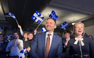 Open this photo in gallery:Parti Québécois leader Paul St-Pierre Plamondon with his wife in Sherbrooke, Que., this weekend. PQ has...