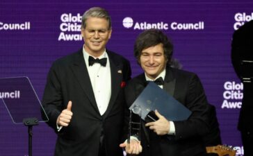Argentine president Javier Milei (R) receives the 2025 Atlantic Council Global Citizen Award from US Secretary of Treasury Scott Bessent...