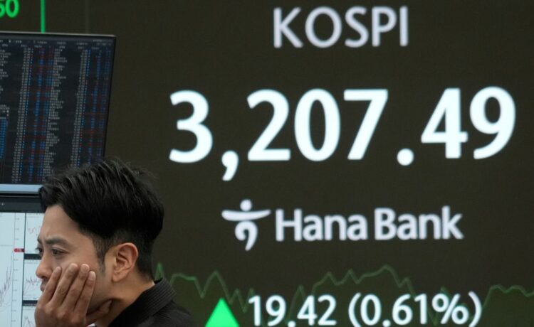 Currency traders watch monitors near a screen showing the Korea Composite Stock Price Index (KOSPI) and the foreign exchange rate between U.S. dollar and South Korean won, right, at the foreign exchange dealing room of the Hana Bank headquarters in Seoul, South Korea, Monday, July 21, 2025. Credit: AP/Ahn Young-joon