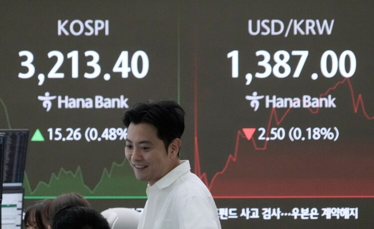 Currency traders watch monitors near a screen showing the Korea Composite Stock Price Index (KOSPI) at the foreign exchange dealing room of the Hana Bank headquarters in Seoul, South Korea, Thursday, Aug. 7, 2025. Credit: AP/Ahn Young-joon