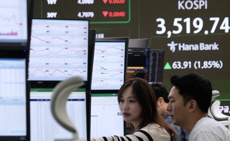 Currency traders watch monitors near a screen showing the Korea Composite Stock Price Index (KOSPI), top left, and the foreign exchange rate between U.S. dollar and South Korean won, top center, at the foreign exchange dealing room of the Hana Bank headquarters in Seoul, South Korea, Thursday, Oct. 2, 2025. Credit: AP/Ahn Young-joon
