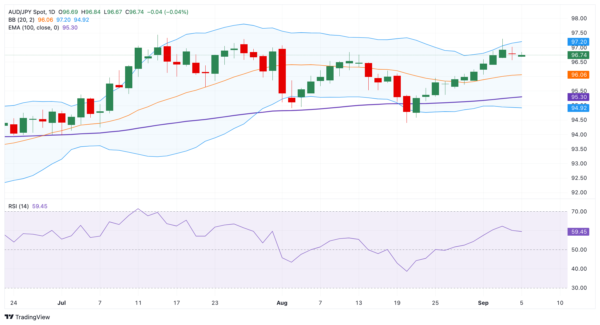 The immediate resistance level for AUD/JPY emerges at 97.20, the upper boundary of the Bollinger Band. A run of green candles and steady trading above the mentioned level could open the door for a move toward 97.43, the high of July 15. The additional upside filter to watch is 98.45, the high of January 27.