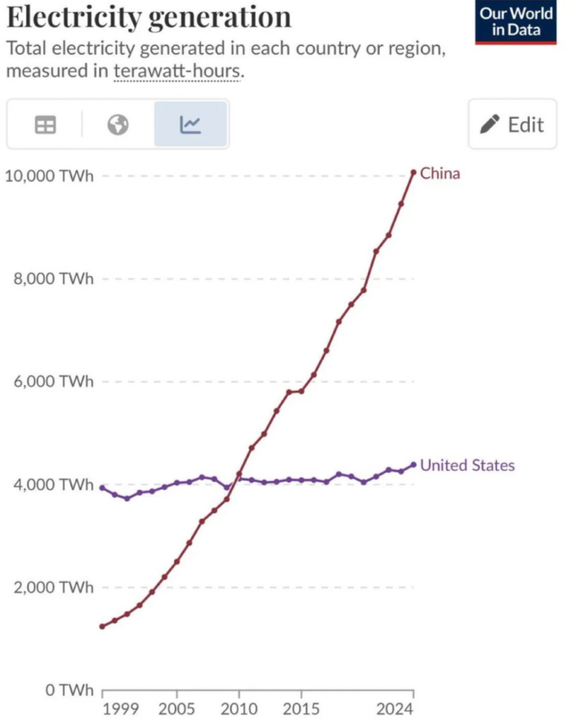 Here’s a comparison of electricity generation between China and the US: