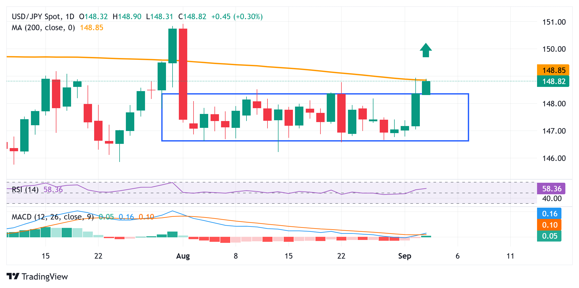 Some follow-through buying beyond the 200-day SMA and acceptance above the 149.00 mark will confirm a bullish breakout through a one-month-old trading range. Given that oscillators on the daily chart have just started gaining positive traction, the USD/JPY pair might then accelerate the positive move towards the next relevant hurdle near the 149.55-149.60 region. The momentum could extend further towards reclaiming the 150.00 psychological mark before spot prices eventually aim to challenge the August monthly swing high, around the 151.00 neighborhood.