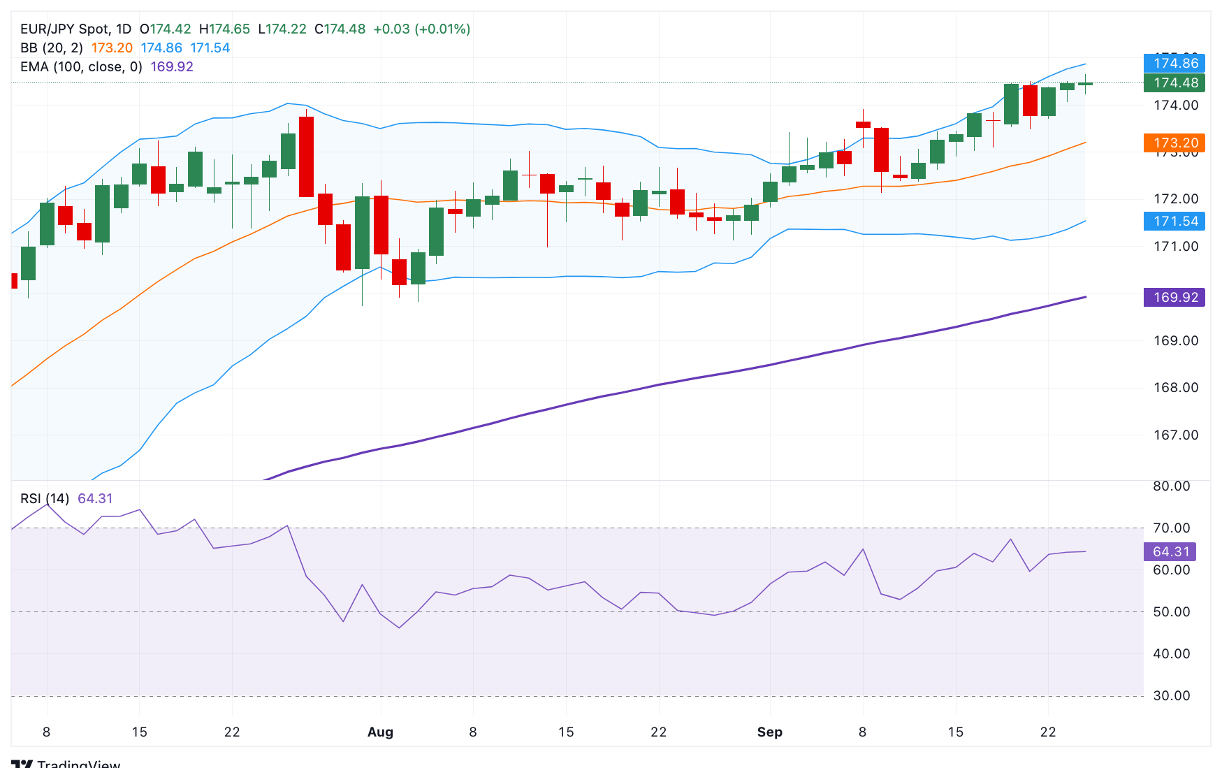 The EUR/JPY cross posts modest gains near 174.50 during the early European trading hours on Wednesday. The Japanese Yen (JPY) softens against the Euro (EUR) after the latest S&P Global flash Japan Manufacturing Purchasing Managers’ Index (PMI) fell at the fastest pace in six months in September.