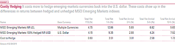 Besides diversification, there’s a cost-related reason for not hedging emerging-markets currencies. Because interest rates tend to be higher in emerging markets, it’s more expensive to hedge those currencies back into the U.S. dollar (Exhibit 2).