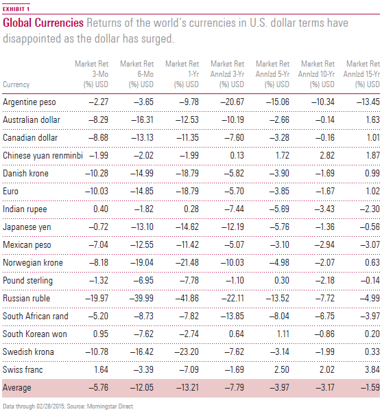 The U.S. dollar looks invincible these days (Exhibit 1). For U.S. investors, its surge can make the case for hedging foreign-currency exposure seem like a one-way argument. Why own other currencies? The dollar gained 17.4% against the euro, 13.6% against the yen, and 7.4% against the pound over the past year through Feb. 23.