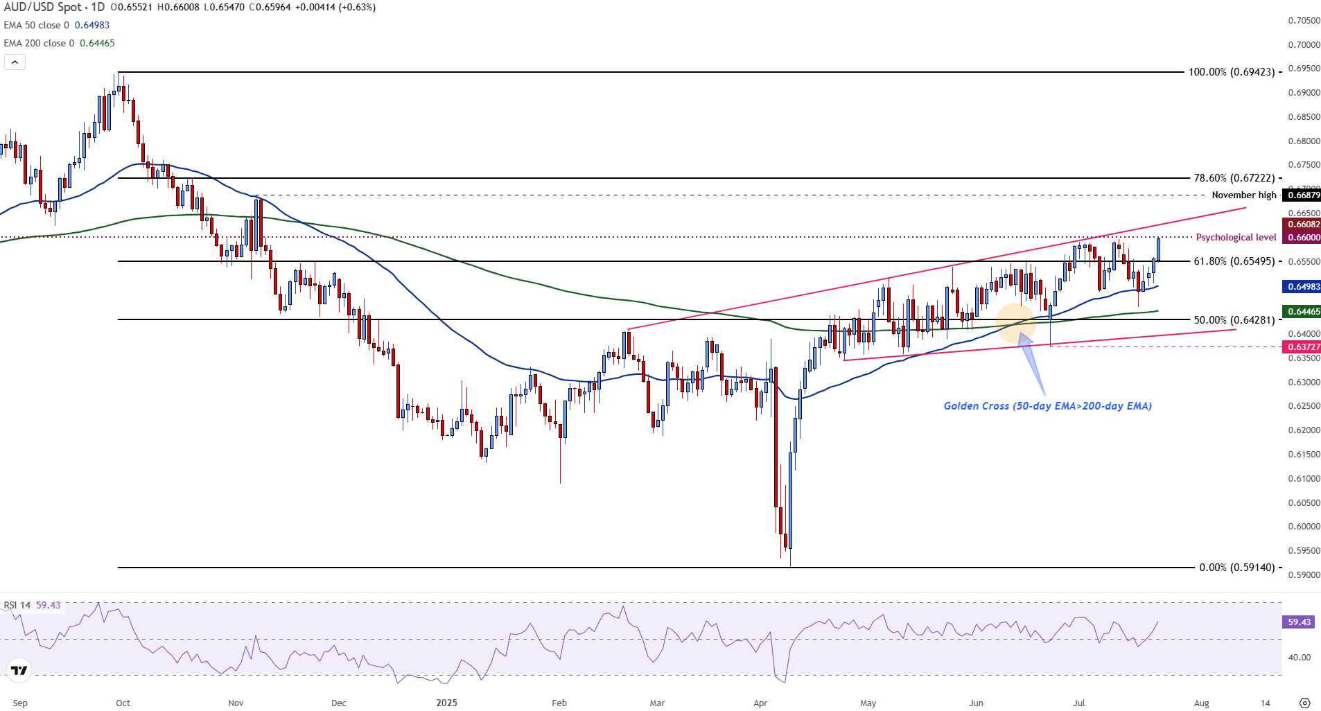 From a technical standpoint, AUD/USD is extending its upside within a well-defined ascending channel. The pair is currently testing the key psychological resistance at 0.6600, a level last seen in November last year.