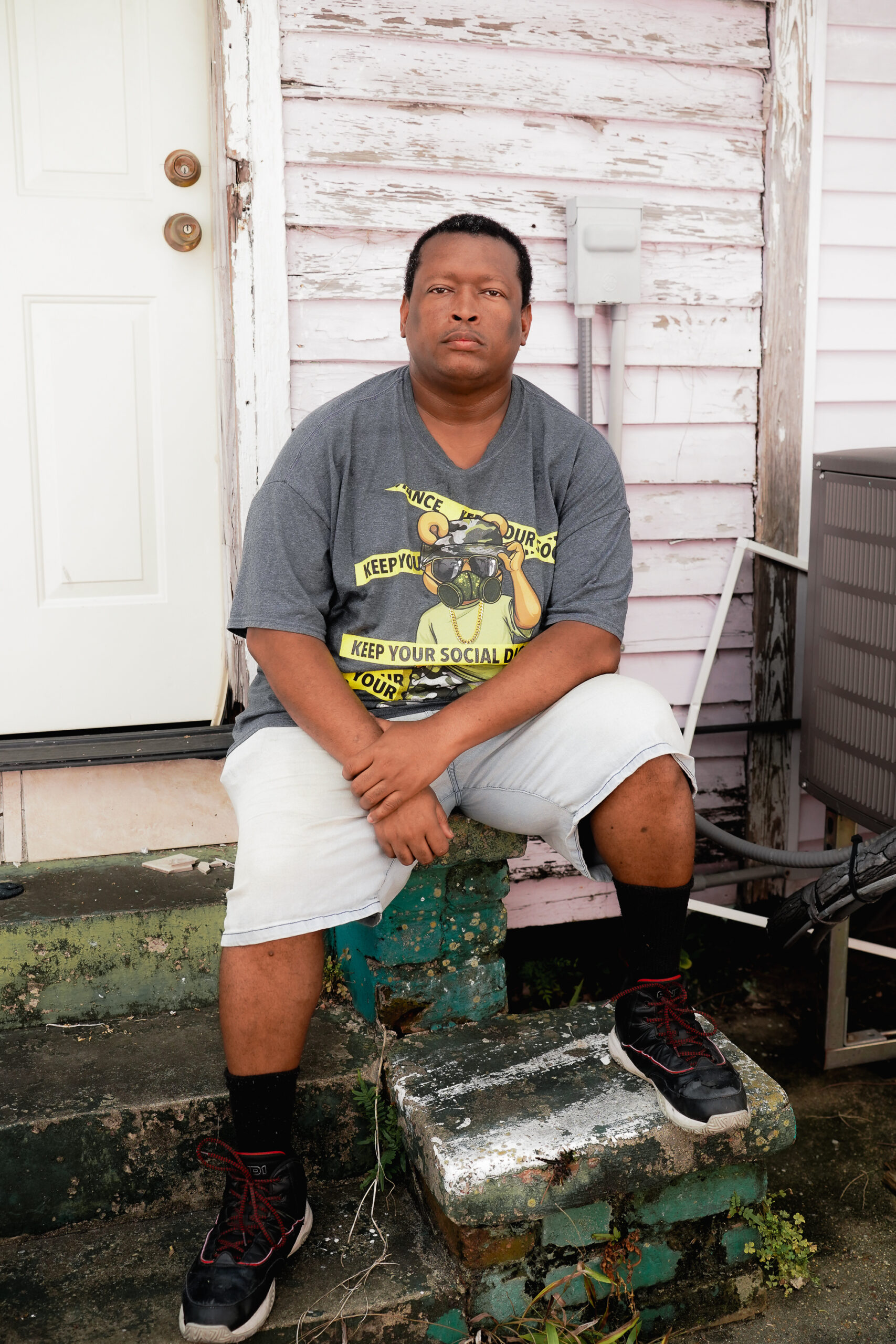 Williams sits on the steps of his home in New Orleans.