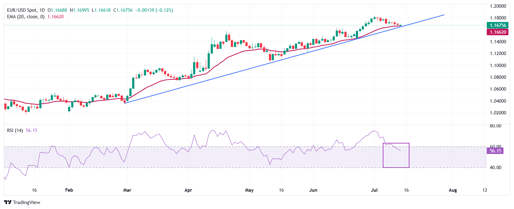 EUR/USD corrects to near the upward-sloping trendline plotted from the February 25 low of 1.0360 plotted on the daily timeframe. The 20-day Exponential Moving Average (EMA) continues to provide support to the pair around 1.1660.