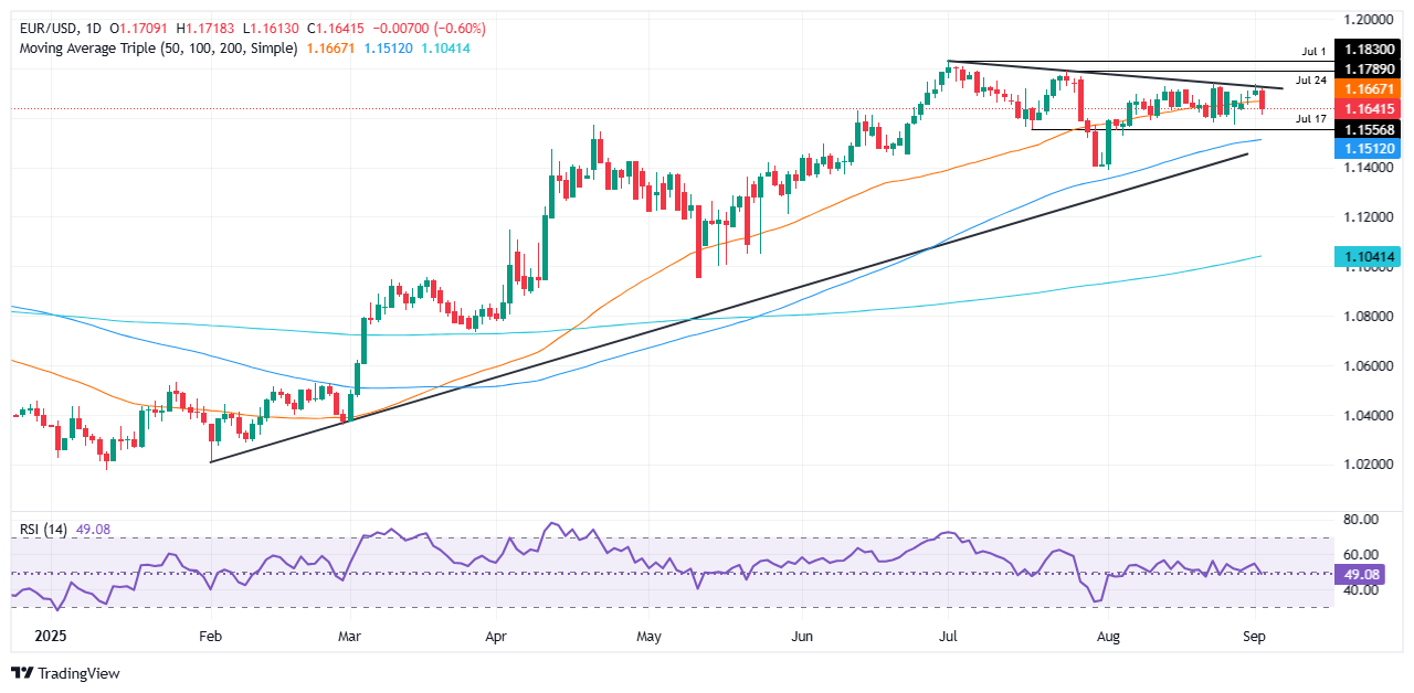 The EUR/USD uptrend paused as the pair dips below the 50-day and 20-day Simple Moving Averages (SMAs), each at 1.1664 and 1.1660, an indication that buyers are losing steam in the near term as traders await the release of the latest Nonfarm Payroll (NFP) figures on Friday.