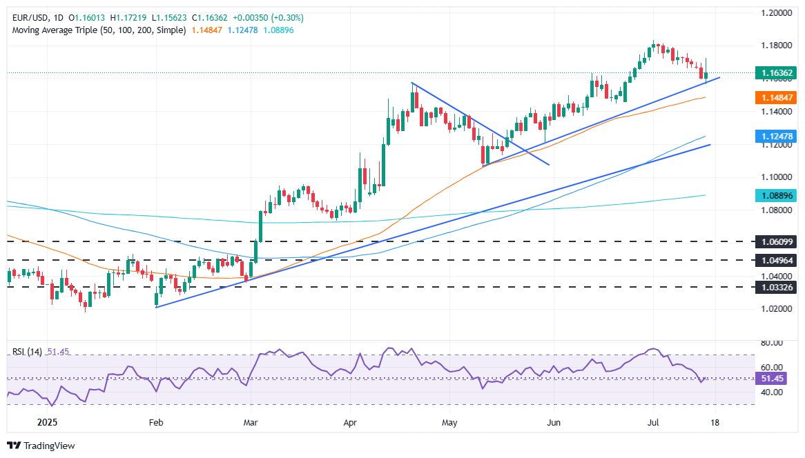 The EUR/USD holds to earlier gains of 0.25% on Wednesday after US President Donald Trump threatened to remove the Federal Reserve (Fed) Chair Jerome Powell. This, along with a softer-than-expected inflation report on the producer side, capped the Euro’s advance versus the US Dollar. At the time of writing, the pair trades at 1.1633 after bouncing off three-week lows of 1.1562.