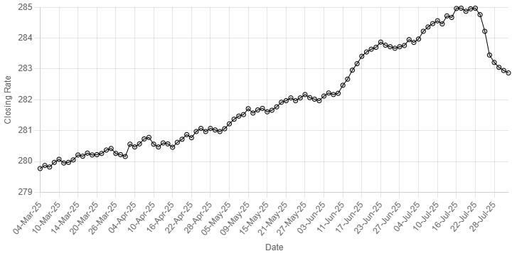 At close, the currency settled at 282.87, a gain of Re0.08.