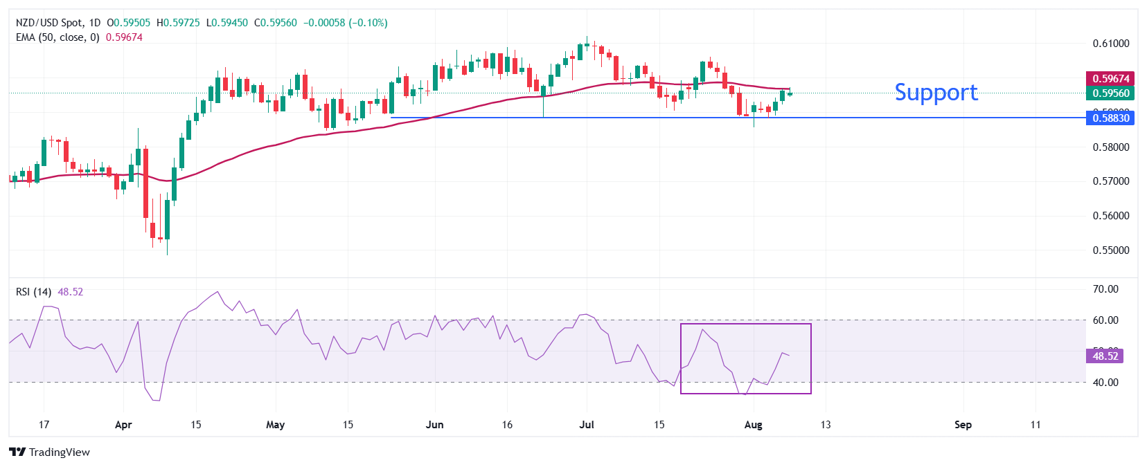 The NZD/USD pair trades in a tight range around 0.5960 during the European trading session on Friday. The Kiwi pair consolidates after a two-day upside move, while the US Dollar (USD) struggles to gain ground due to upbeat expectations that the Federal Reserve (Fed) will cut interest rates in the September meeting.