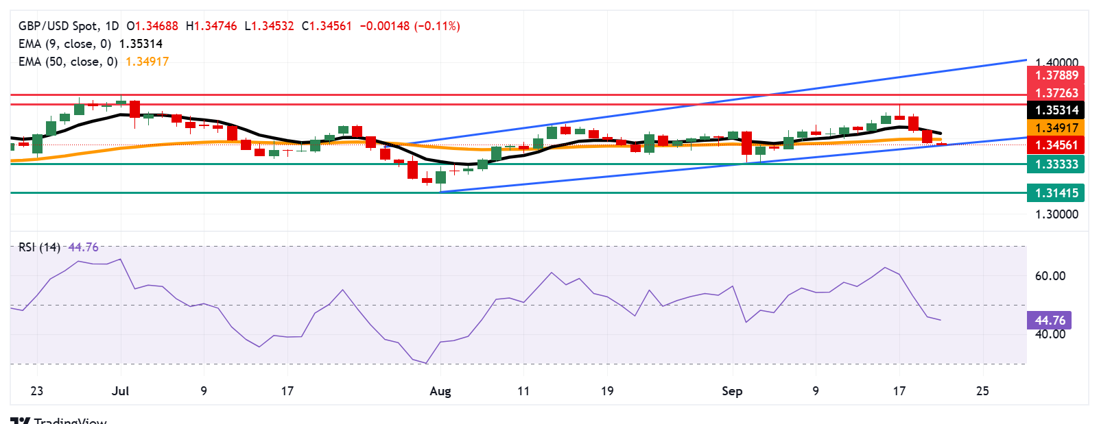 The GBP/USD pair continues its four-day losing streak, trading around 1.3460 during the Asian hours on Monday. The bearish shift appears as the daily chart’s technical analysis shows that the pair is on the verge of breaking below the ascending channel pattern.