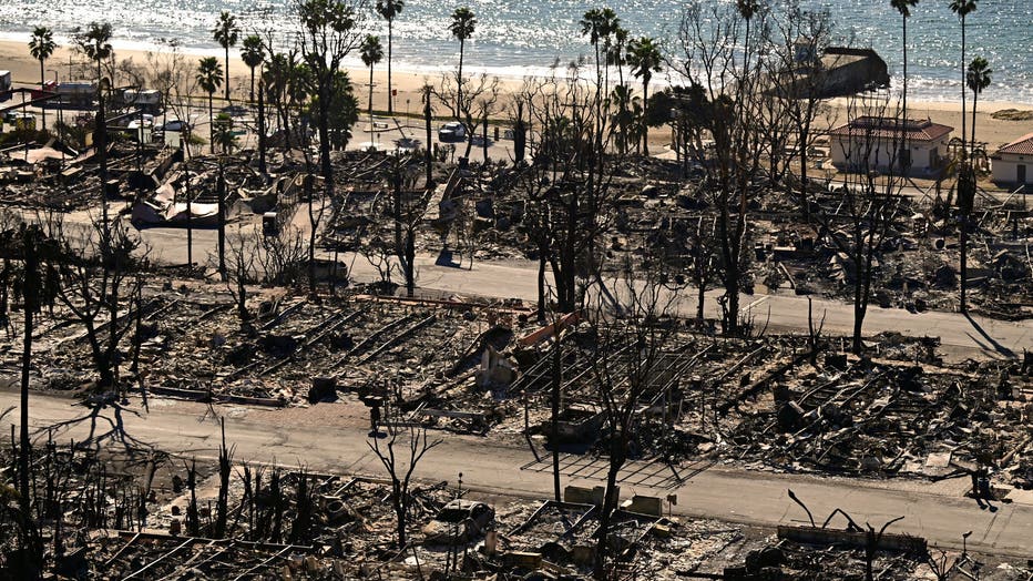 Charred homes and burnt cars are pictured amid the rubble of the fire-ravaged Pacific Palisades Bowl Mobile Estates in Los Angeles, California, on January 13, 2025. (Credit: AGUSTIN PAULLIER/AFP via Getty Images)