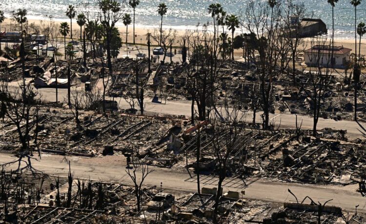 Charred homes and burnt cars are pictured amid the rubble of the fire-ravaged Pacific Palisades Bowl Mobile Estates in Los Angeles, California, on January 13, 2025. (Credit: AGUSTIN PAULLIER/AFP via Getty Images)