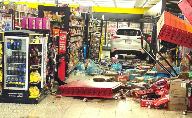 According to a crash report, the driver told police she was parking her car at the store and passed out. Security camera footage shows the driver pulling into the parking spot, followed by hitting the gas pedal to go forward.