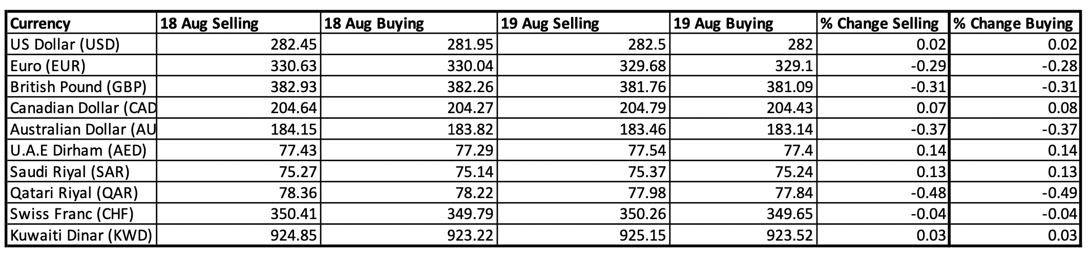 The Swiss franc held almost flat at Rs350.26/349.65 versus Rs350.41/349.79 a day earlier. The Kuwaiti dinar, meanwhile, edged higher to Rs925.15 for selling and Rs923.52 for buying, compared to Rs924.85/923.22 previously.