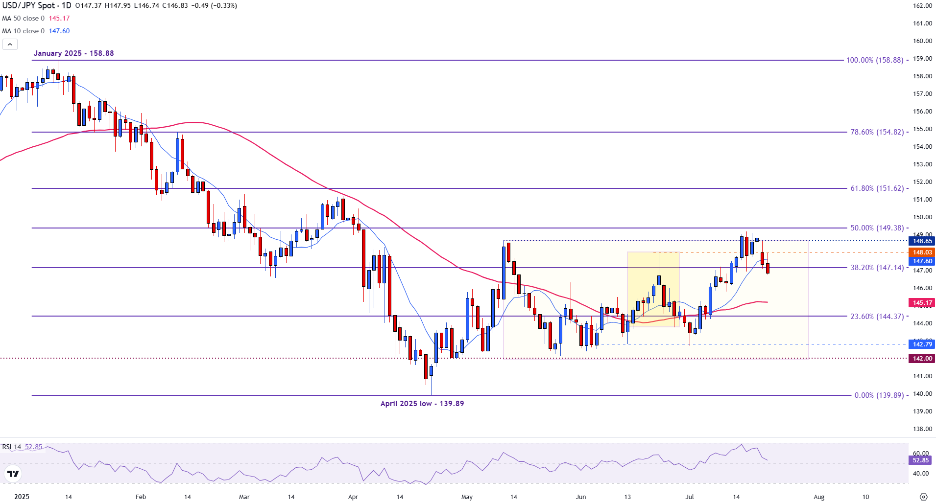 USD/JPY is trading below 147.00 at the time of writing with markets focused on the outcome of ongoing tariff negotiations in Washington.