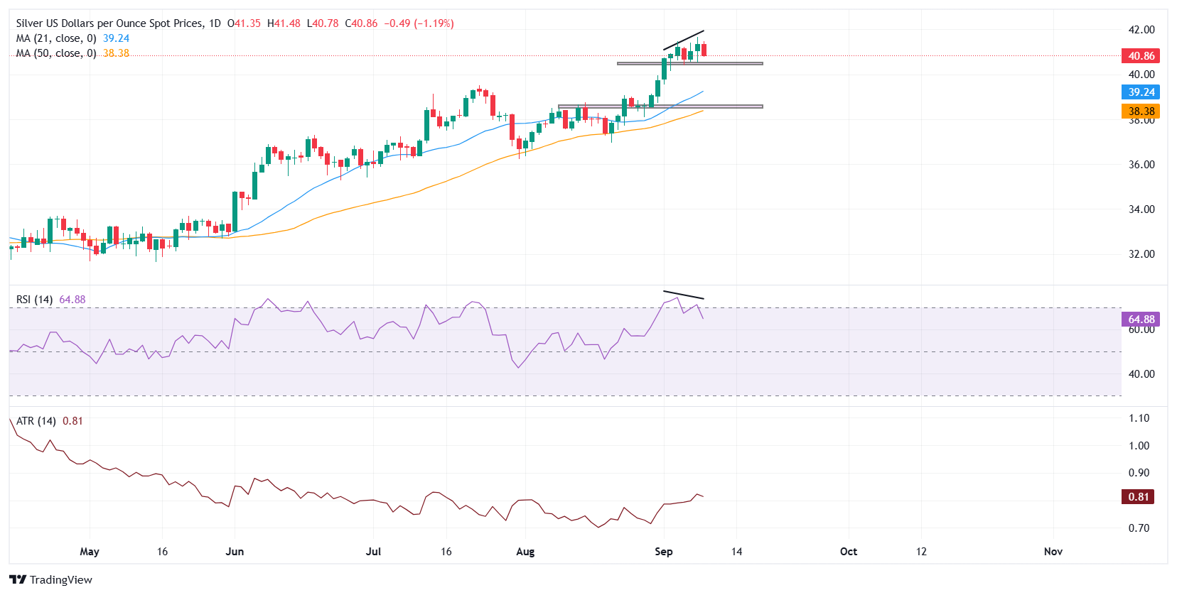 The white metal has been trapped in a tight band between $41.50 and $40.50 since last week, after hitting a fresh 14-year peak around $41.67 on Monday. While the pullback reflects profit-taking and short-term USD strength, the downside remains limited as markets are almost fully convinced that the Federal Reserve ( Fed) will lower interest rates at its September 17 monetary policy meeting. Lower borrowing costs reduce the opportunity cost of holding non-yielding assets such as Silver, keeping the broader bullish tone intact.
