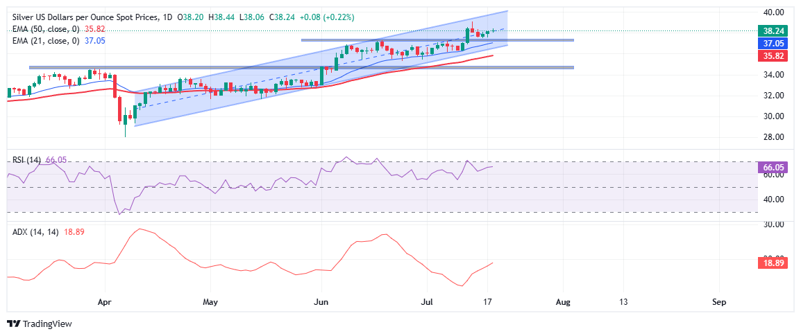 Silver (XAG/USD) is treading water on Friday, with spot prices hovering near $38.25 after marking a fresh 14-year high of $39.13 earlier this week. The metal continues to draw support from a firmly bullish structure, trading within a well-defined ascending channel on both the daily and weekly charts. While momentum has cooled slightly near multi-year highs, the broader technical outlook remains positive, with prices still comfortably positioned above key short-term moving averages.