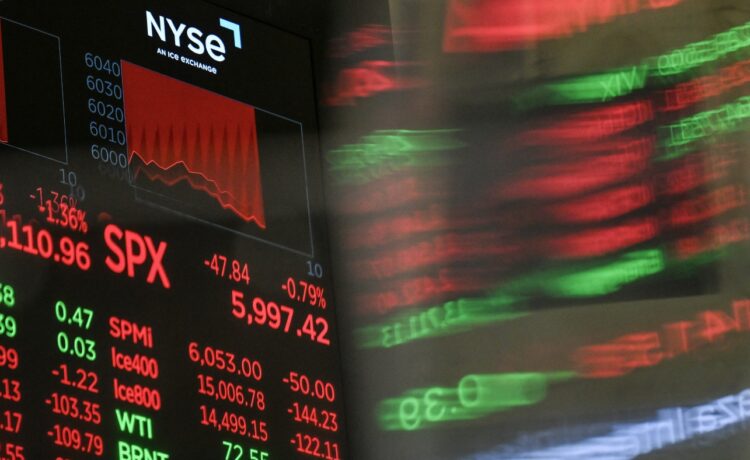 Market statistics are displayed on a screen as traders work on the floor of the New York Stock Exchange at the opening bell on June 13 in New York City.