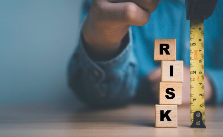 Businessman using tape measure with risk wording for risk analysis investigate management and assessment concept.