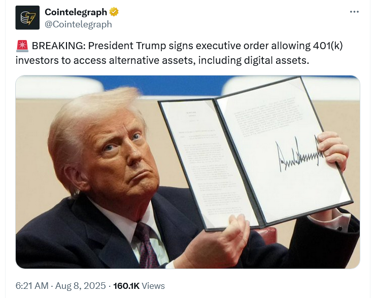 The poll came as US President Donald Trump signed an executive order earlier this month permitting US 401(k) retirement plans to include Bitcoin (BTC) and other cryptocurrencies, opening access to more than $9 trillion in assets.