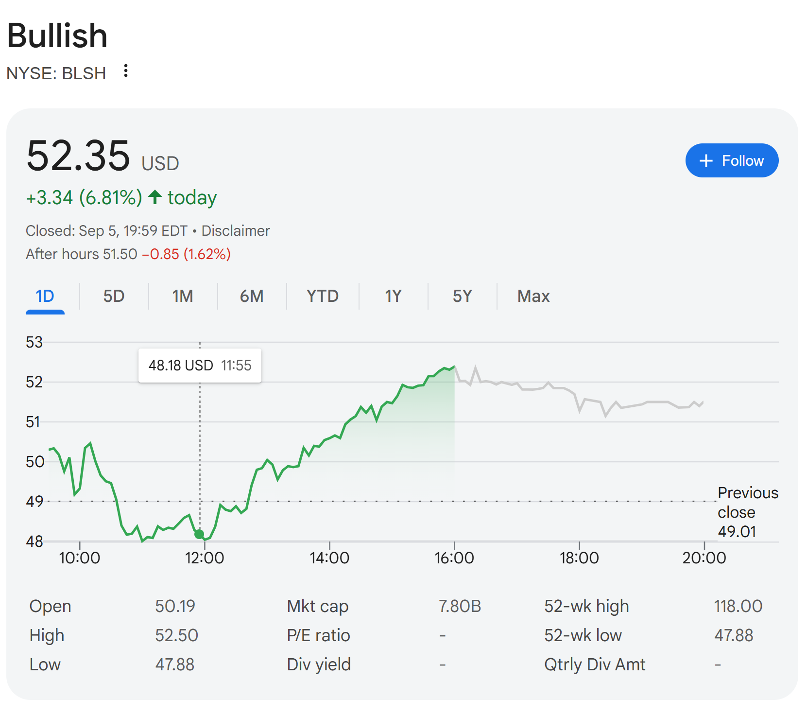 As reported, Bullish’s stock surged 83.8% during its IPO session and raised $1.1 billion, making it one of the year’s most-watched public listings in crypto.