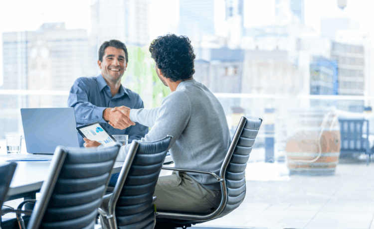 Two men in an office shake hands to close a deal.