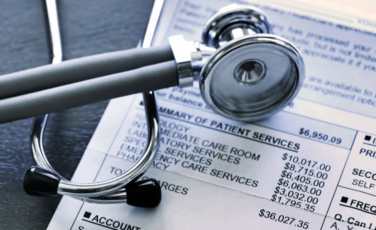 A closeup of a medical bill with a stethoscope resting on top of it.