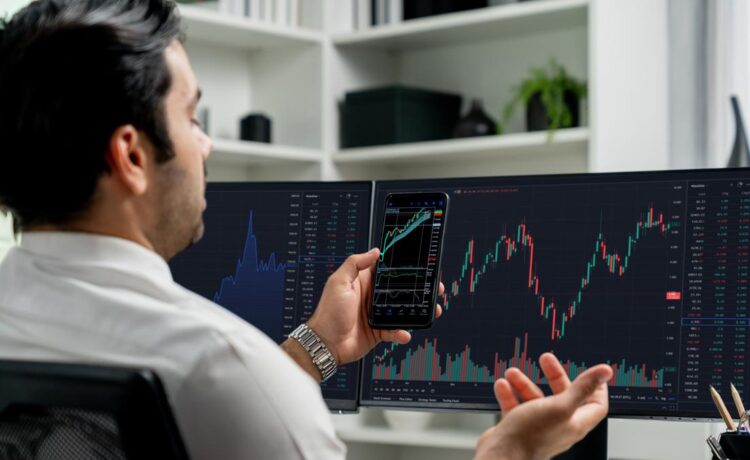 Trader businessman searching on smartphone, analyzing in dynamic stock exchange investment