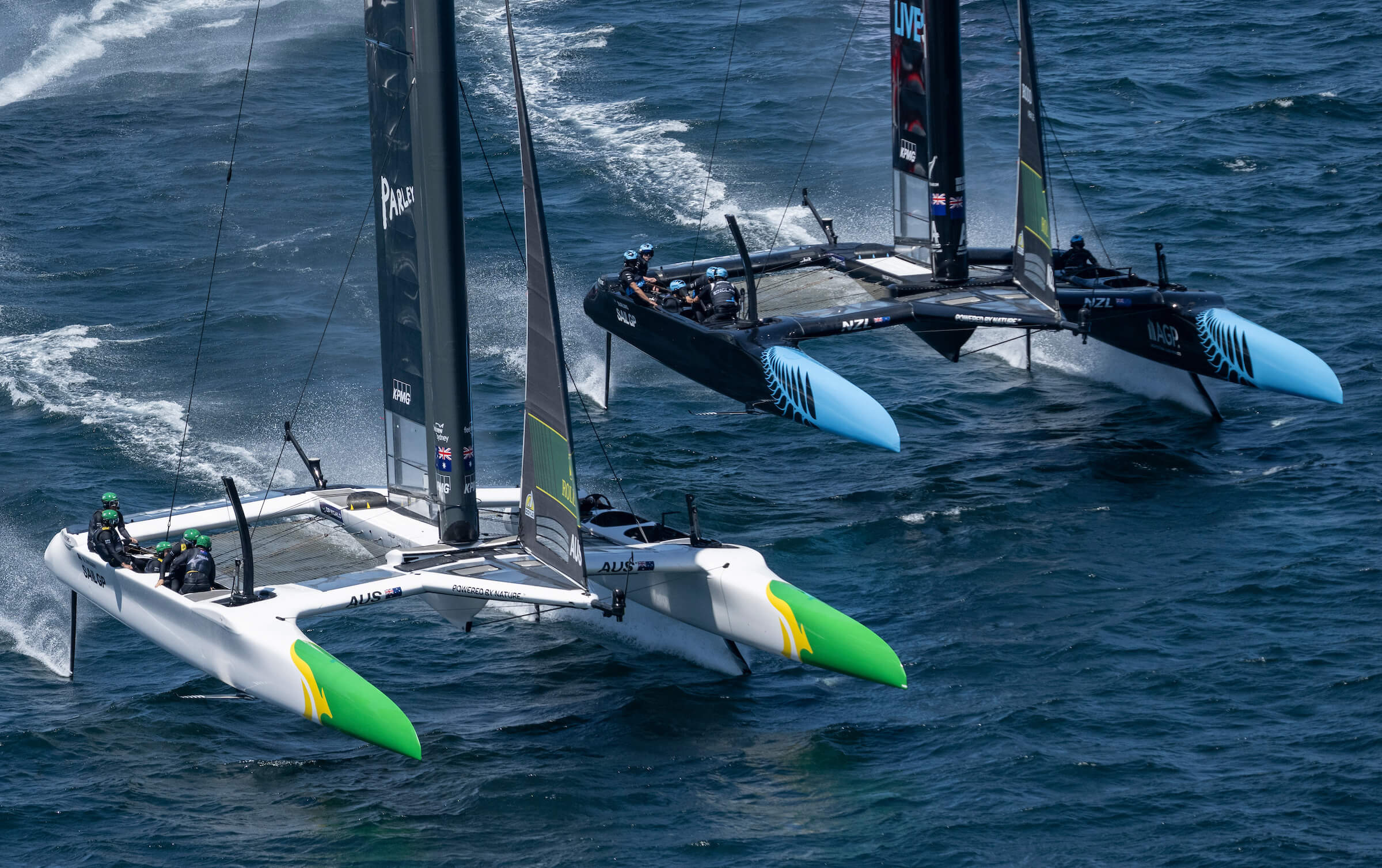 The Australian team (left) during practice before their home grand prix in Sydney in February 2025. (Jon Buckle for SailGP)