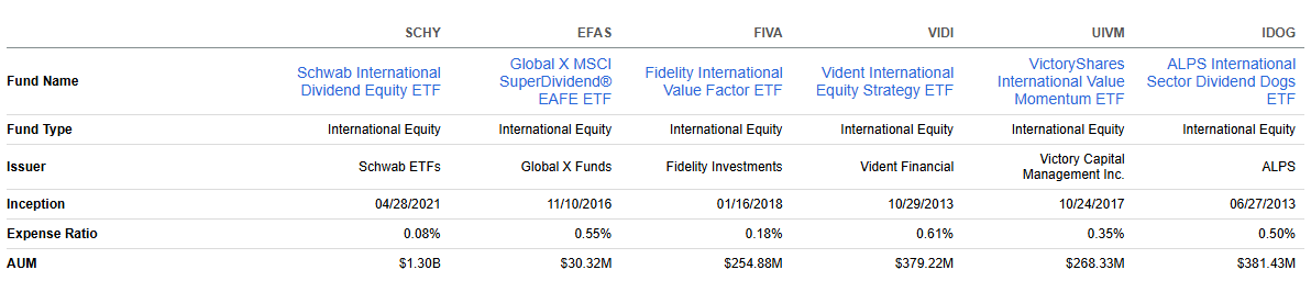 The top-performing peer is the Global X MSCI SuperDividend EAFE ETF (EFAS), outperforming peers across most historical periods. Despite the appealing performance, EFAS has a mere $30mm in AUM and more restrictive liquidity. EFAS may be seen as a relatively more diversified strategy, with the top 10 holdings making up only 22% of the total portfolio weight despite only holding 58 stocks.