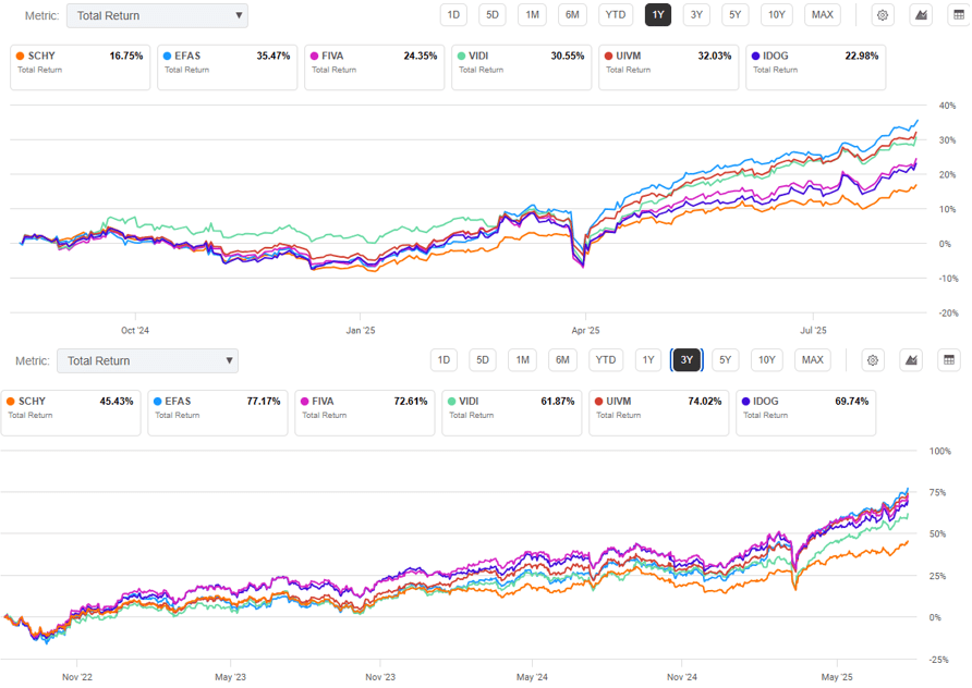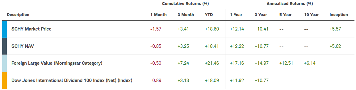Compared to peer strategies, SCHY is the lowest cost strategy. SCHY is one of the larger portfolio strategies with $1.3b in AUM while providing substantially more depth for active trading. Despite these factors, SCHY has underperformed peer international dividend income strategies across historical periods on a total return basis.