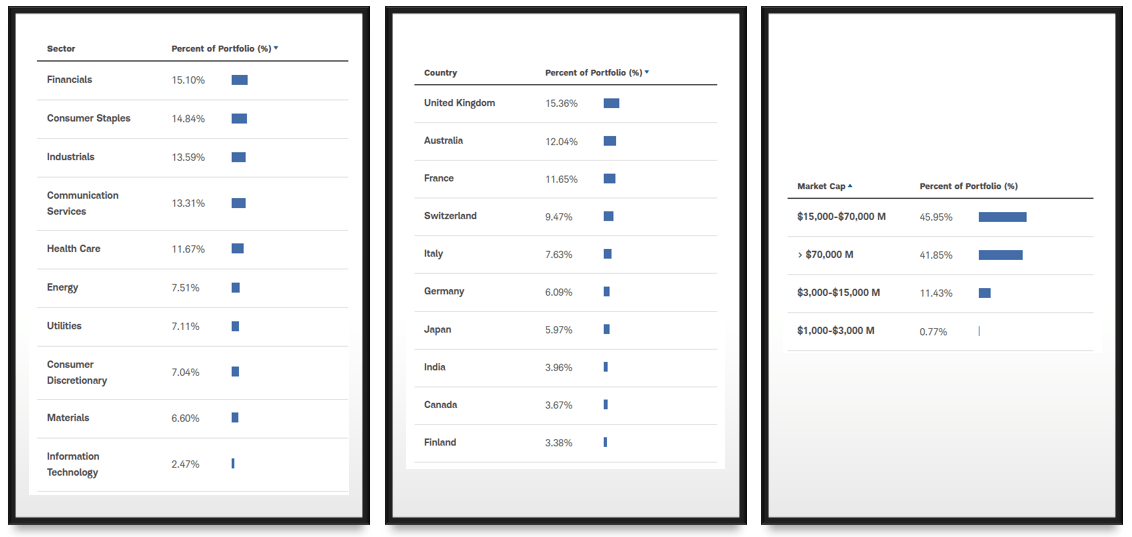 The top 10 holdings make up 40% of the total portfolio weight, while the bottom 10 make up 0.75% of the portfolio weight. Top companies within the strategy include British American Tobacco (BTI) at 4.76%, Wesfarmers (OTCPK:WFAFF) at 4.21%, and BHP Group (BHP) at 4.17%. British American Tobacco is known for its cigarette brands, including Camel, Newport, and Natural American Spirit. Wesfarmers is an outdoor living and building materials retailer, similar to Fleet Farm in the US Midwest. BHP is an international mining company and is a primary supplier of copper, iron ore, and coal.