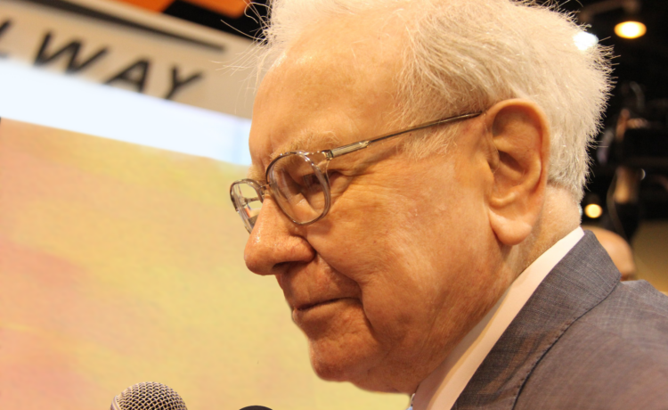 Warren Buffett in front of microphones.