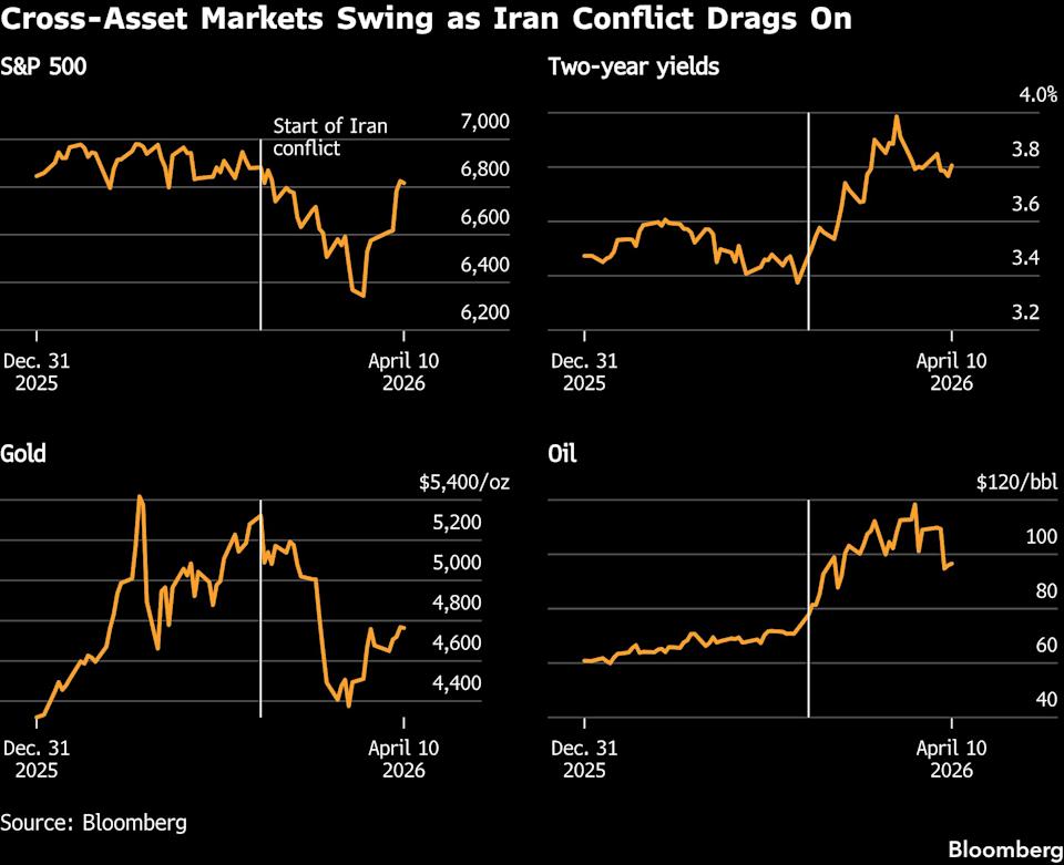 The escalating rhetoric heightens the focus on the truce between the two sides, which triggered a sharp rally for risky assets last week, with the S&P 500 Index (^SPX) climbing more than 3.5%, an MSCI gauge of emerging-market equities rising 7.4%, and Bitcoin (BTC-USD) surging almost 10%. Futures on West Texas Intermediate oil tumbled 13.4% through Friday, while Brent ended at around $95 a barrel, down from roughly $112 in March.