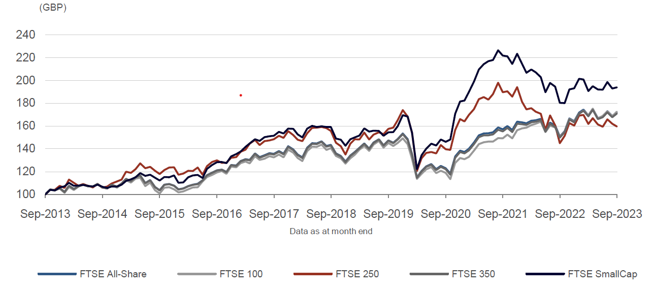 Figure 1: total returns by index for the last 10 years, as at 29 September 2023