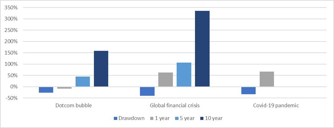 Looking back at performance following a recession, the Numis Smaller Company index achieved an impressive 10-year return of 160% and 340% respectively after the dotcom bubble and global financial crisis, as shown below: