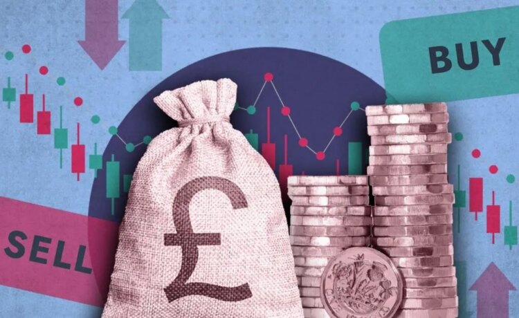 A creative image composition with a blue background and a stock graph with red and green lines on. There is a box with 'BUY' and another with 'SELL' written on them. In the centre there is a bag with a pound sign on and a stack of coins.