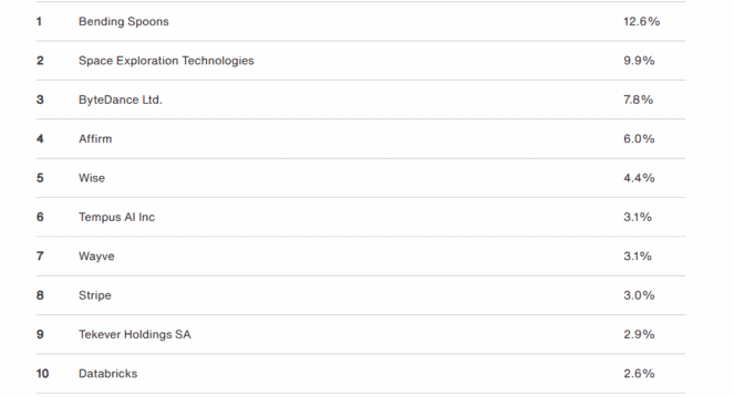 A quick glance at the top 10 holdings shows this to be the case. Rocket pioneer SpaceX is valued at $350bn while analytics firm Databricks’ latest funding round puts it at a $100bn valuation.
