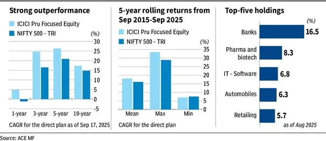 Five-year rolling returns from September 2015 to September 2025 show ICICI Prudential Focused Equity’s consistent performance, with the fund beating the Nifty 500 TRI almost 68 per cent of the times. Furthermore, in 5-year rolling returns over the aforementioned 10-year period, the fund generated more than 12 per cent returns for a healthy 94 per cent of the times and in excess of 15 per cent for 56 per cent of the time.