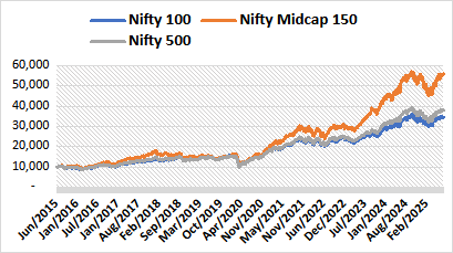 The 10-year trend of performance for Nifty 100, Nifty Midcap 150, and Nifty 500 distinctly indicates the mid cap space has been the leader in performance, particularly after 2020.