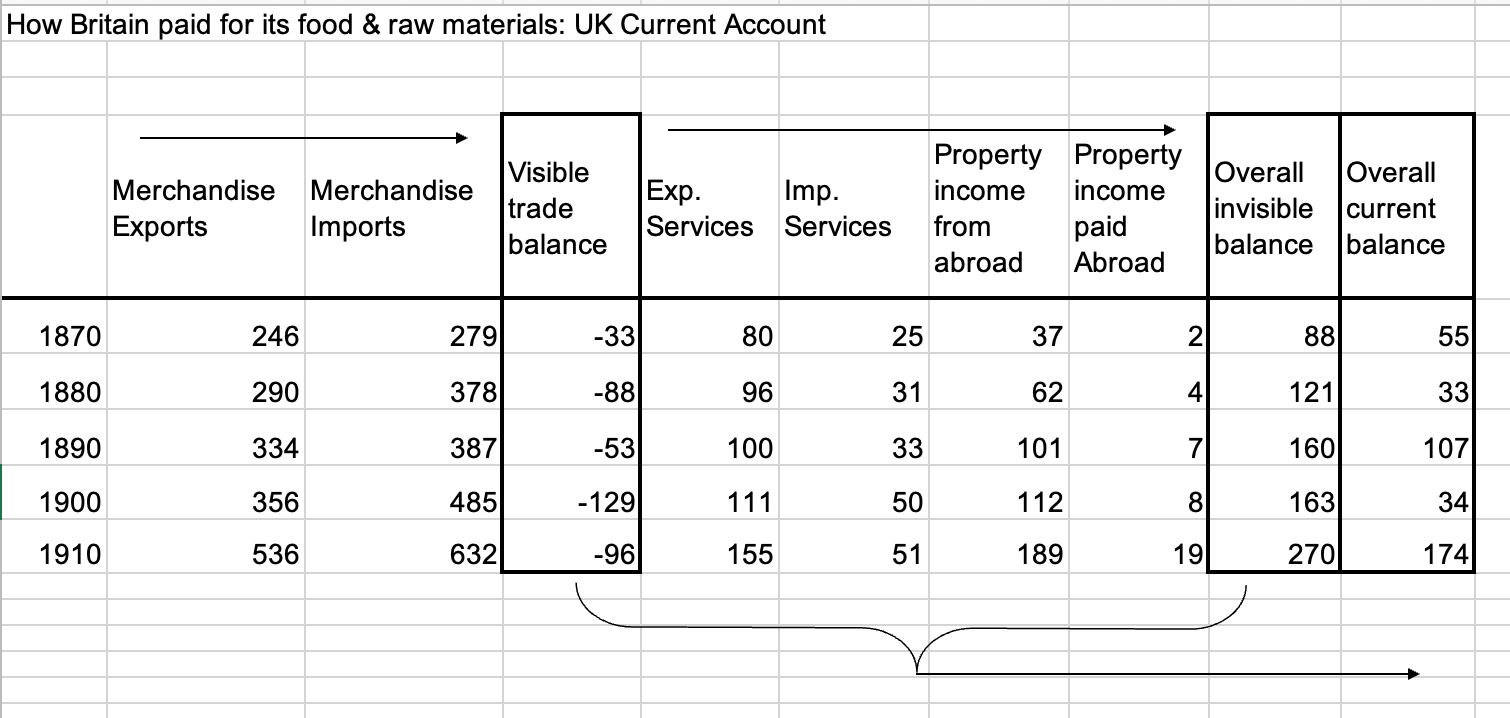From the point of view of hegemonic stability it is hard to think of a better mix: a consistent and large “downhill” flow of capital, widely spread across the periphery of the world economy, heavily invested in developmental infrastructure and sovereign debt, with a wide open trade account that allowed borrowers to repay their debts with trade surpluses. All the while, Britain retained a large and growing export trade whilst shifting steadily into high-value services.