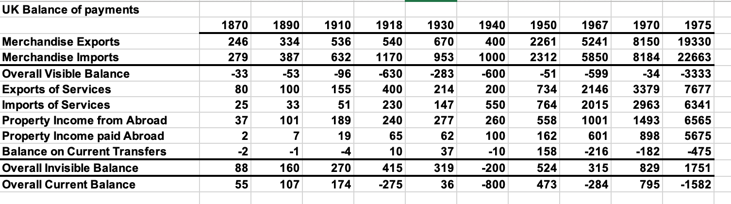 From the Victorian period onwards, the UK, like the US today, ran a trade deficit. It provided markets for foreign competitors, triggering an unceasing debate about national decline and elites selling out “British industry”. Hobson was part of that debate about British decline, creating another subtext of confusion when he is invoked in 21st century America. Because, unlike in the US today, British goods exports remained robust and diversified, paying for the vast majority of goods imports. Furthermore the trade deficit was more than made up by the large surplus on service income and the even larger surplus from property income from abroad. Overall this generated a large current account surplus that was then reinvested, further increasing the net surplus on property income from abroad. In many years Victorian and Edwardian Britain’s surplus on property income was larger than the overall current balance, meaning that new investment abroad was more than paid for by the proceeds of existing investment. In effect, the foreign investment account was operating like a self-renewing wealth endowment.