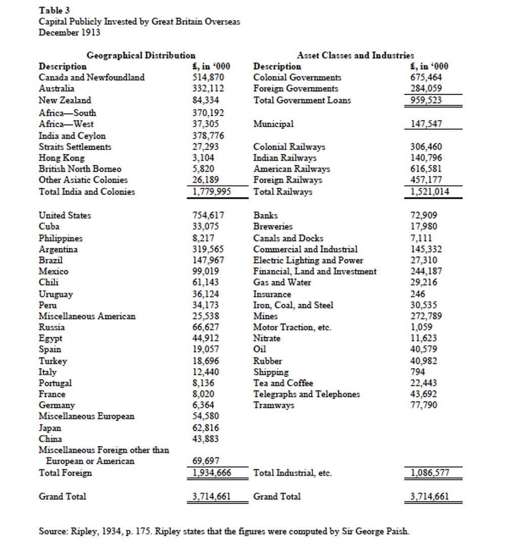 One can see from the data why Hobson focused on the Boer war. In 1913 Britain had almost as much invested in South Africa as it did in all of its sprawling South Asian possessions. It was British investment that financed the Mexican oil industry. And it was also British money that paid for the world’s largest cattle ranch, the XIT cattle ranch, in Texas. As one Texas historian writes: